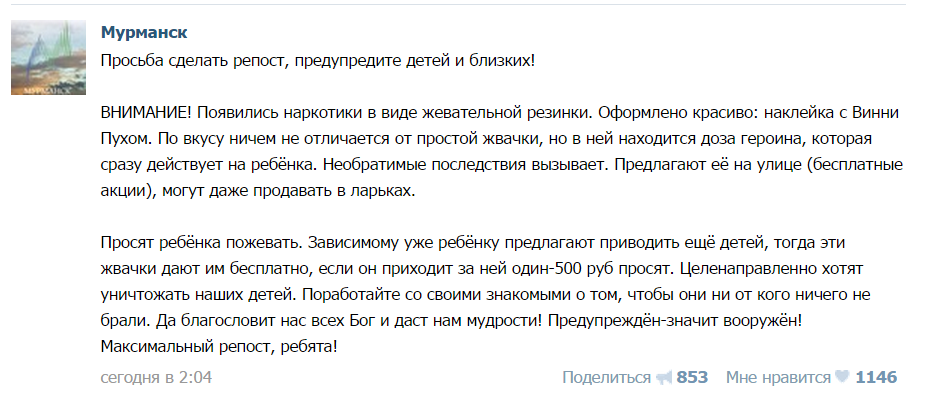 С сообществах Мурманской области в социальных сетях появились одинаковые сообщения о распространении «наркотиков в виде жевательной резинки». В сообщении приводятся ужасные подробности о приучении детей и организации целой сети несовершеннолетних дилеров.
