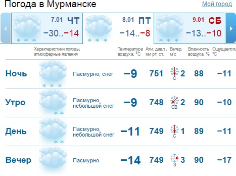 Но уже в пятницу ожидается значительное потепление. По информации Гисметео.ру, в ночь с 7 на 8 января на территории Мурманской области будет -12-14о. а днем столбик термометра поднимется до -8-9о.