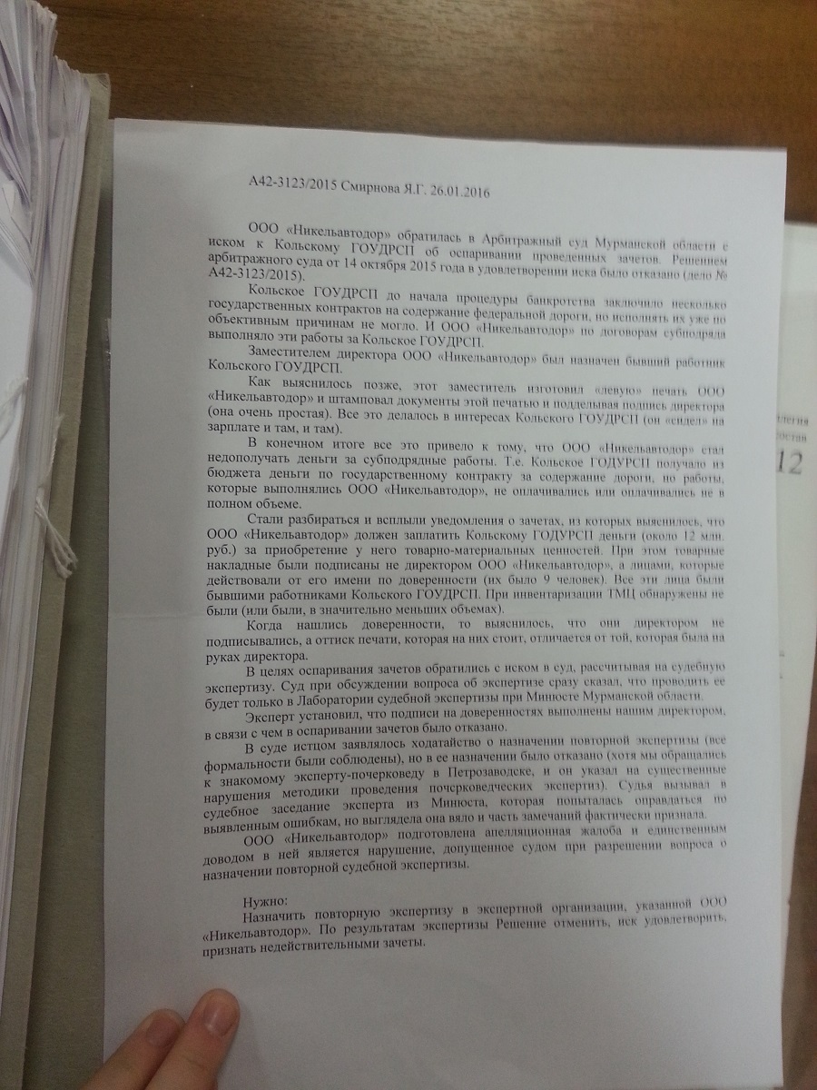Так, авторами документа, который, по словам источника, подложили в подшитое дело, выражается недовольство принятым решением Арбитражного суда Мурманской области.