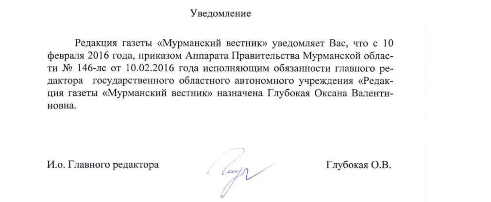 Исполняющей обязанности главного редактора газеты «Мурманский вестник» назначена Оксана Глубокая. Как сообщила СеверПост секретарь главредактора издания, смена руководителя произошла 10 февраля 2016 года.