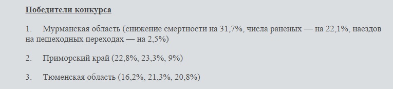 Всего в конкурсе приняли участие 58 российских регионов. Жюри оценивало такие показатели, как снижение смертности от ДТП, сокращение количества раненых и числа наездов на людей на пешеходных переходах, сообщает «Парламентская газета». Помимо этого, учитывались региональные инвестиции в обустройство дорог, оснащение медицинских учреждений, полиции и МЧС, а также количество профилактических мероприятий, работа с жителями.