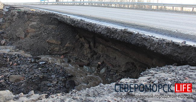 На въезде в Североморск талыми водами размыло дорогу. По данным издания severlife.ru, сейчас на место прибыли сотрудники ГИБДД, которые решают, что дальше делать.