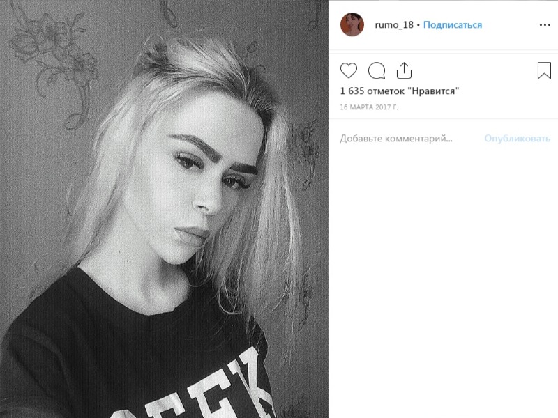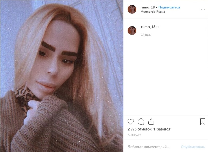 Подобная страница есть у одной мурманской девушки под ником rumo_18. Возможно, подписчиков привлекает неестественное лицо Insta-дивы: угловатые, грубо очерченные брови, непропорционально большие губы и очень маленький нос.