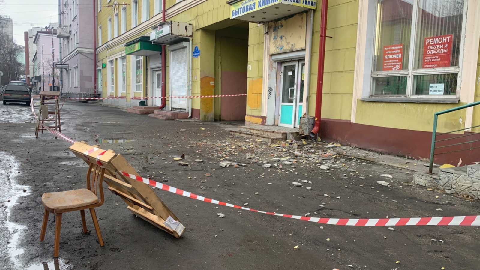 В Мурманске с дома №9 на улице Октябрьская обваливается штукатурка. Опасное место огородили красно-белой лентой для безопасности пешеходов.