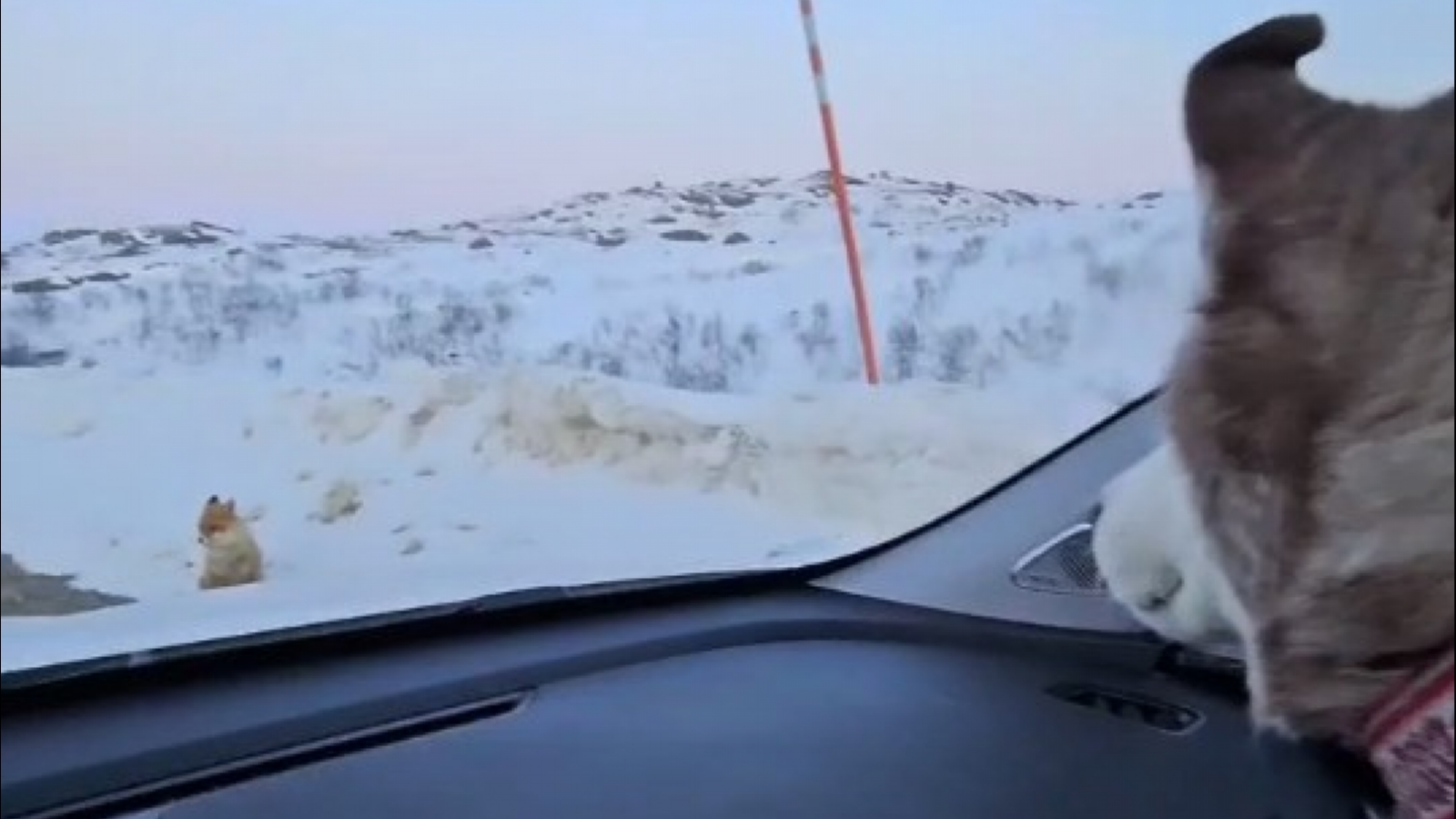 На кадрах видно, как из припаркованного автомобиля две хаски с удивлением смотрят на лису. Она сидит рядом с машиной.