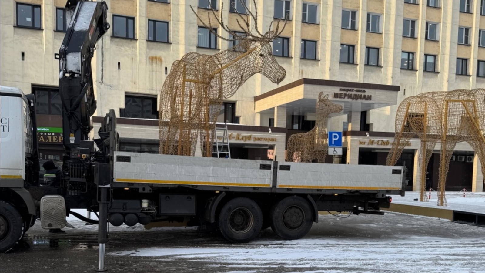 Примечательно, что ёлку на площади начали убирать ещё в начале февраля, но единичные атрибуты новогоднего праздника, видимо, было решено оставить. В результате светодиодные олени у входа в «Меридиан» простояли до первых дней весны.
