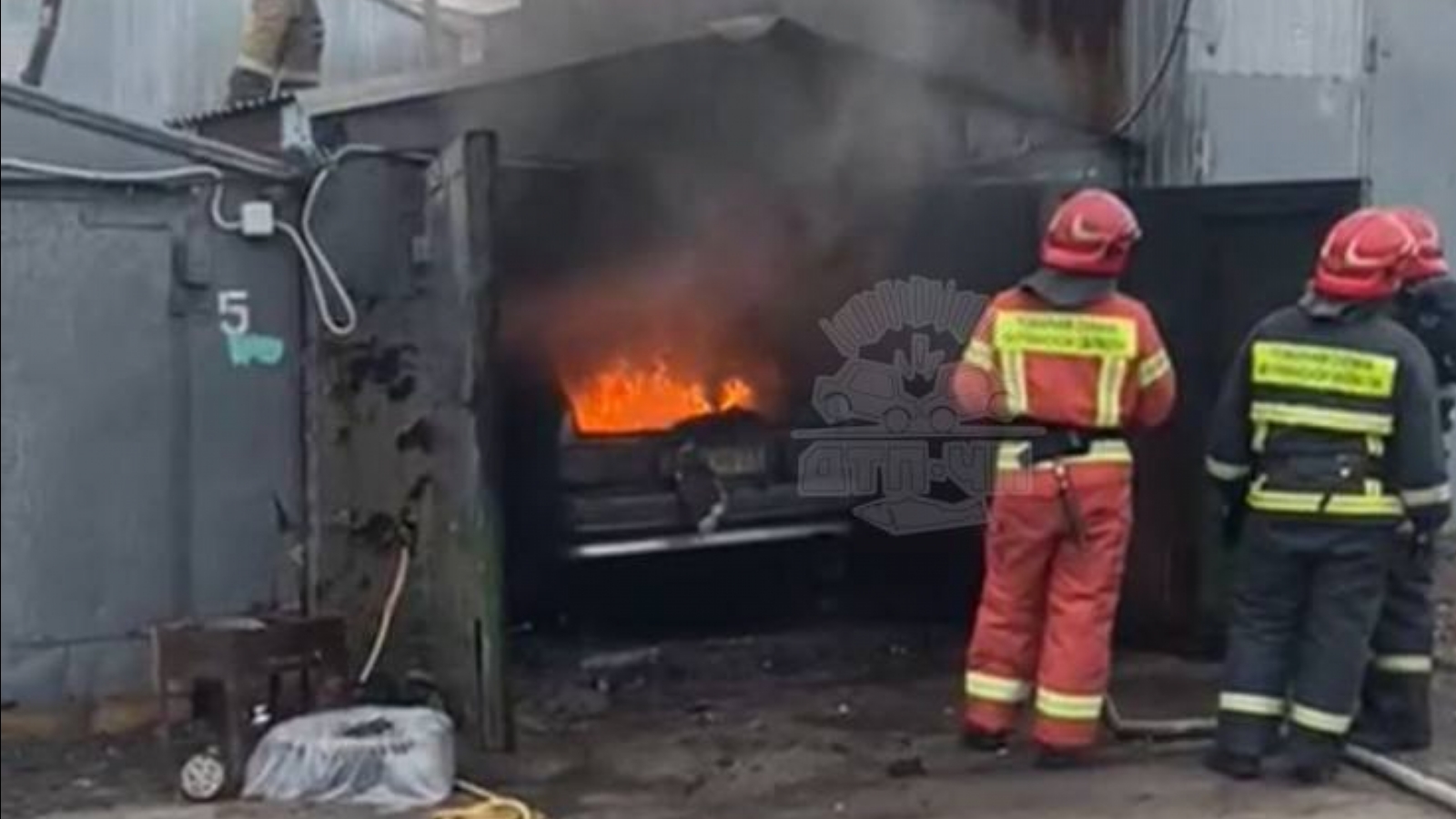 Гараж вскрыли. Внутри видна машина и открытый огонь. Идёт тушение возгорания.
