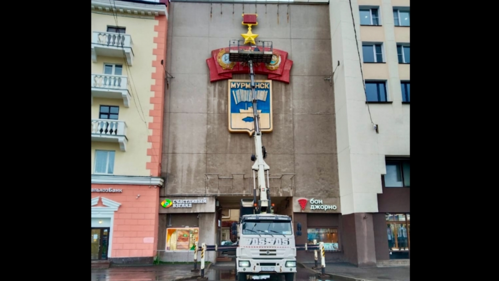 В центре Мурманска выполнили покраску барельефа, изображающего государственные награды и герб.