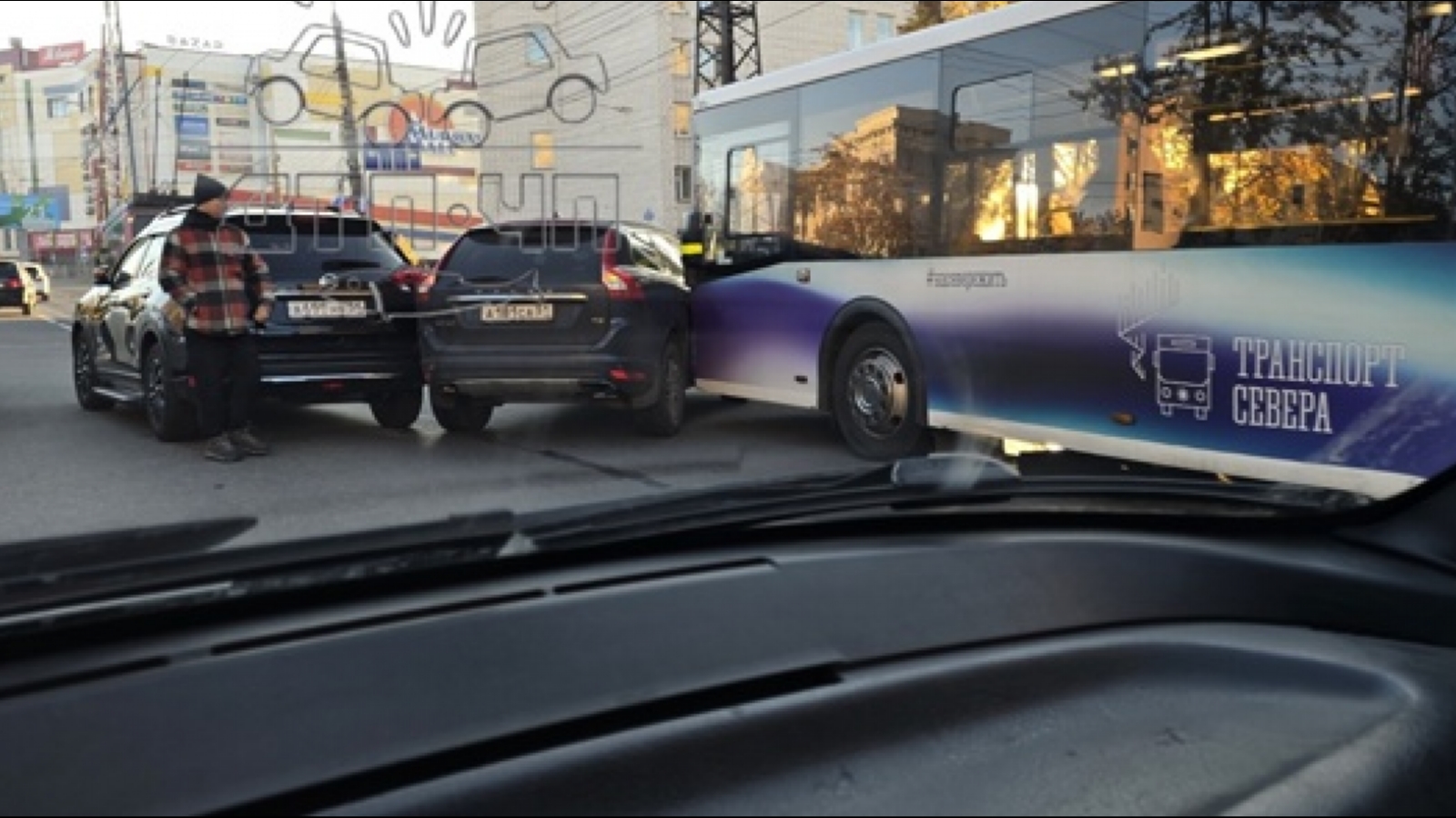 Предположительно, автомобиль марки Geely застрял между Nissan и пассажирским автобусом. Причина аварии пока неизвестна.