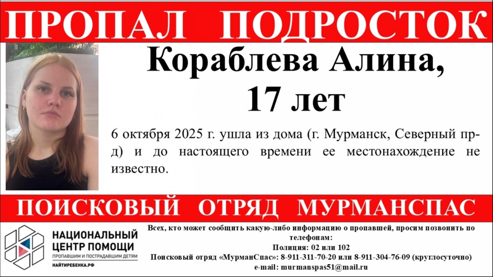 В Мурманске ищут 17-летнюю Алину Кораблёву. 6 октября она ушла из дома и до настоящего времени её местонахождение неизвестно.