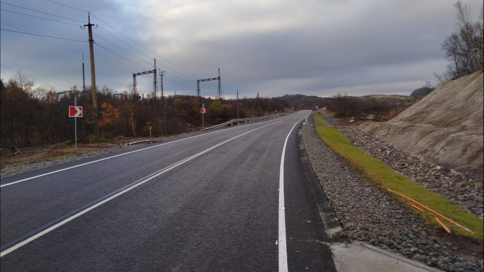 На первом из двух оставшихся участков дороги в Териберку полностью уложили асфальтовое покрытие и сделали разметку.
