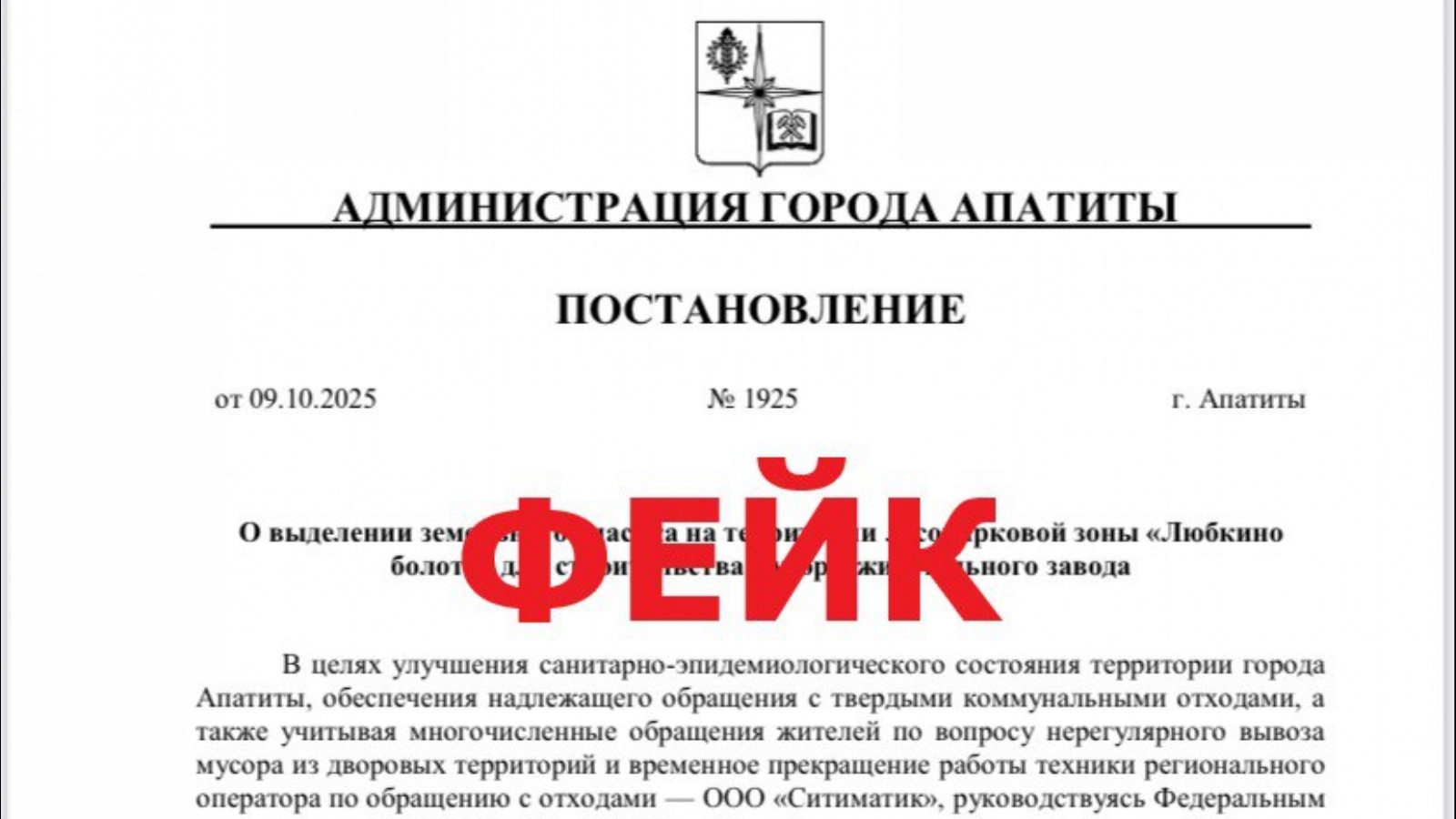 В соцсетях Мурманской области распространяют постановление о строительстве мусоросжигательного завода в Апатитах.