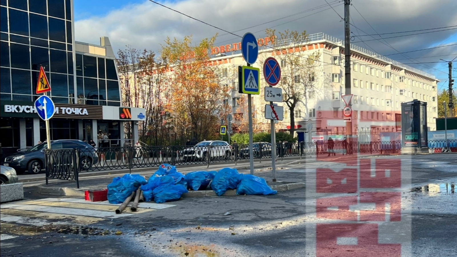 Синие пакеты видно издалека, они лежат рядом с пешеходным переходом напротив «Волны».