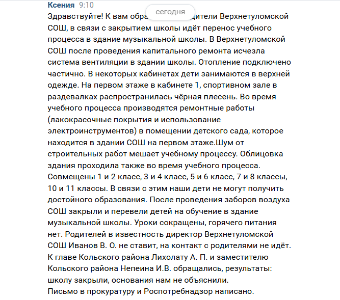 Как они отмечают в своём письме в редакцию СеверПост, после капитального ремонта в Верхнетуломской средней общеобразовательной школе возникли серьёзные проблемы с вентиляцией и отоплением, появились очаги чёрной плесени, а шум от продолжающихся ремонтных работ мешает учебным занятиям.
