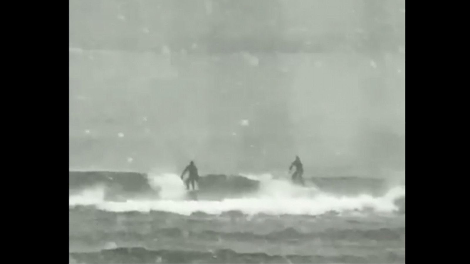 На кадрах видно, что сёрферы одеты в специальные гидрокостюмы, разработанные для холодной и ветреной погоды.