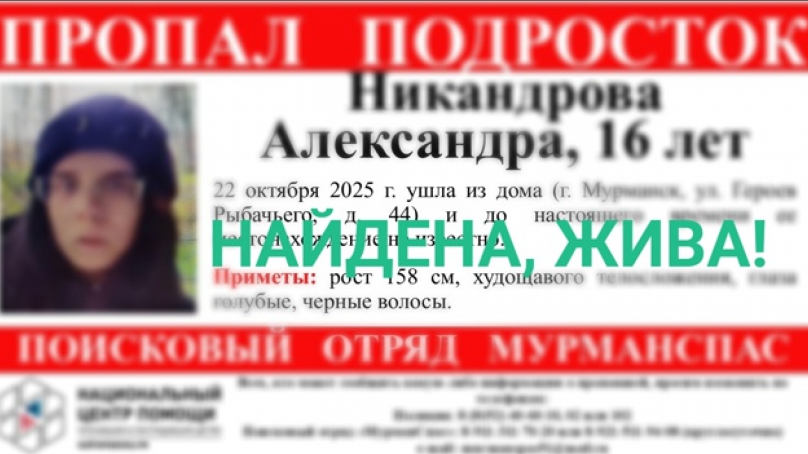 В Мурманске найдена пропавшая 16-летняя Никандрова Александра. Она ушла из дома 22 октября и перестала выходить на связь.