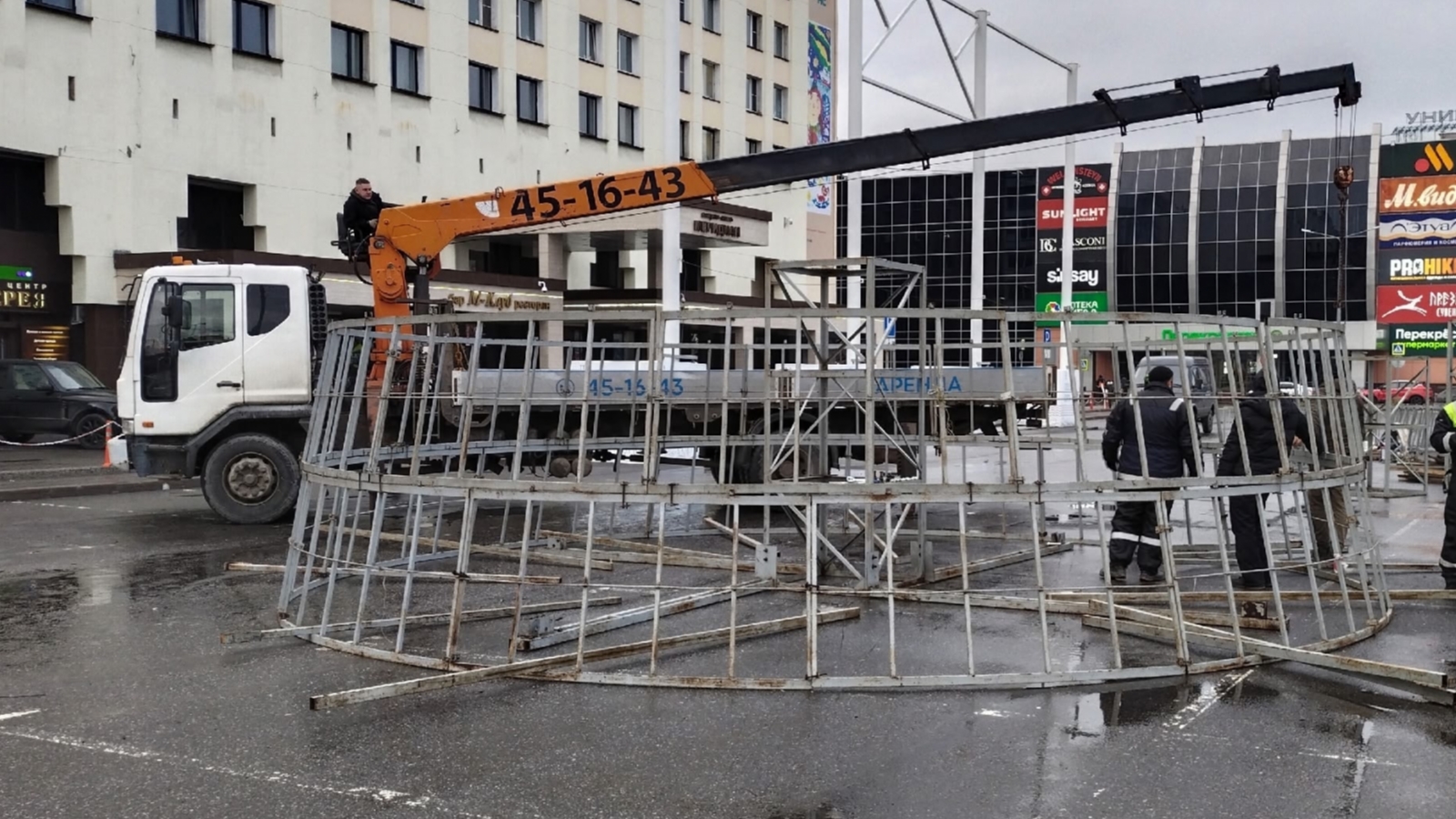 На улице Воровского, перед гостинично-деловым центром «Меридиан», начали устанавливать главную городскую ёлку Мурманска.
