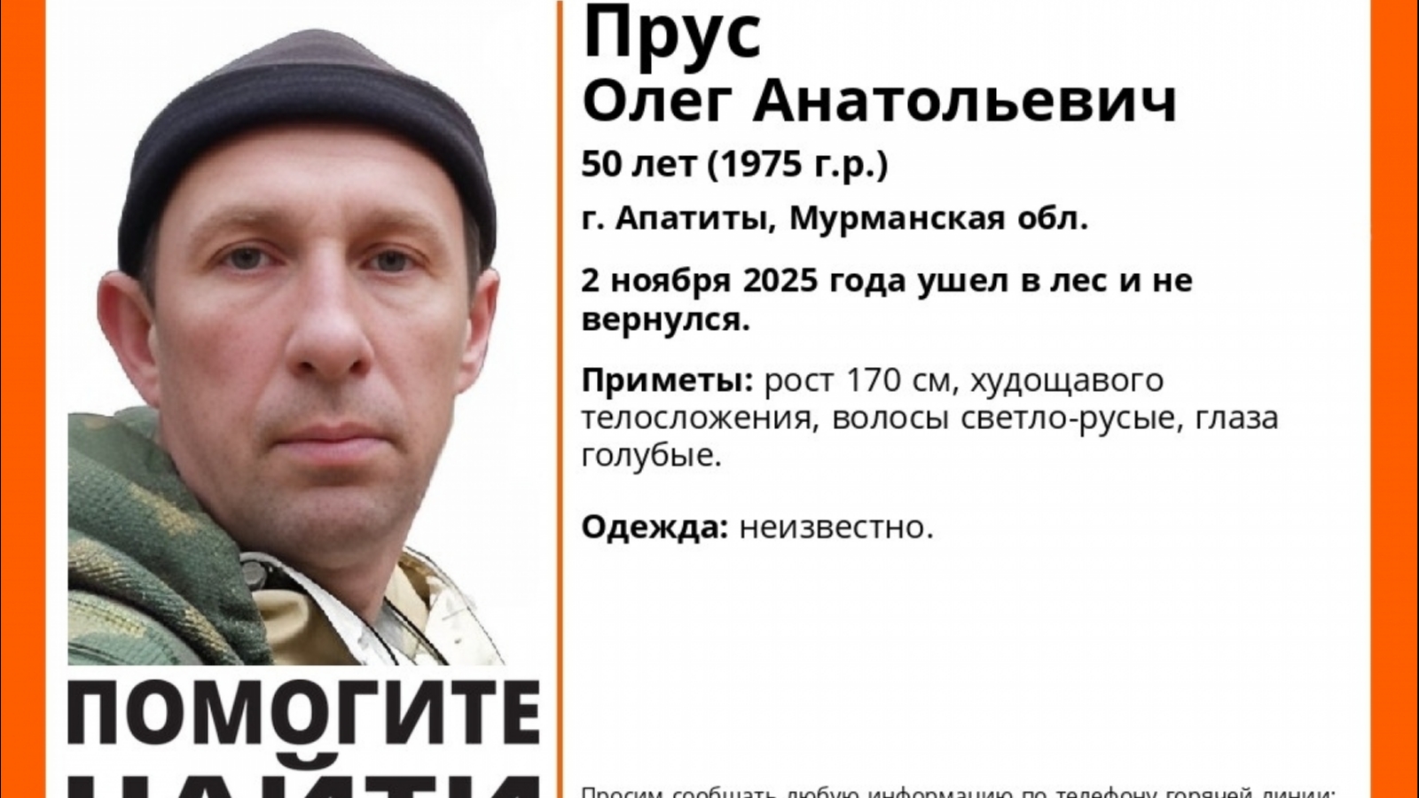 В Апатитах ищут 50-летнего Олега Пруса. Со 2-го ноября его местонахождение неизвестно.