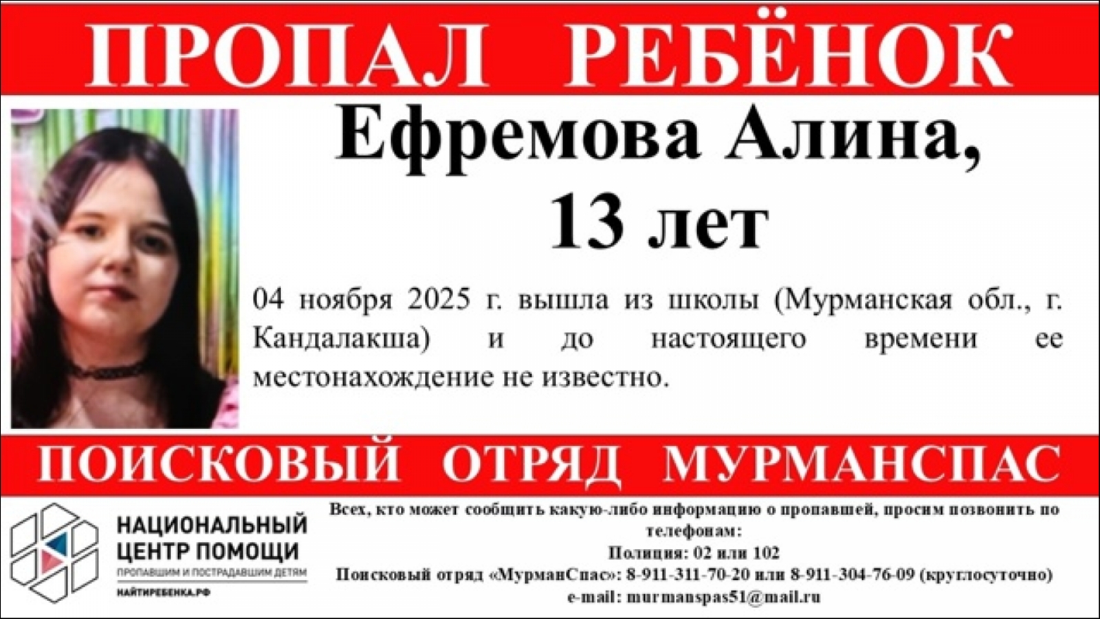 4 ноября в Кандалакше вышла из школы и пропала 13-летняя Алина Ефремова. Её местонахождение неизвестно.