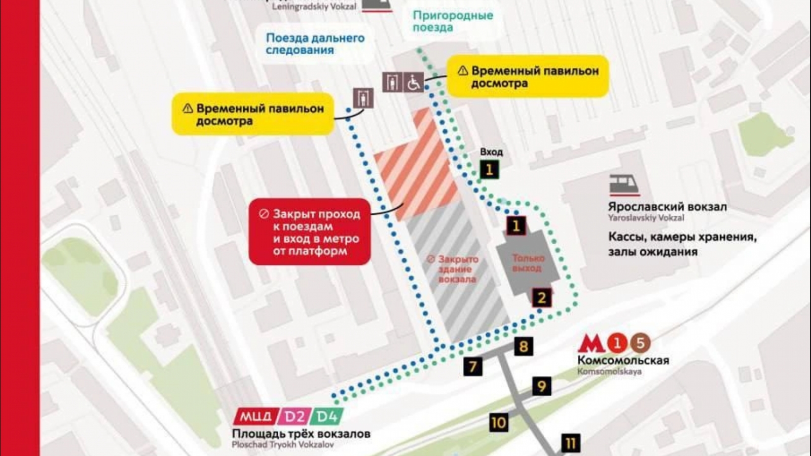 Для посадки на поезда дальнего следования нужно будет пройти через временные павильоны для досмотра. Они будут установлены со стороны проезда Комсомольской площади и со стороны Ярославского вокзала (он будет оборудован пандусом).