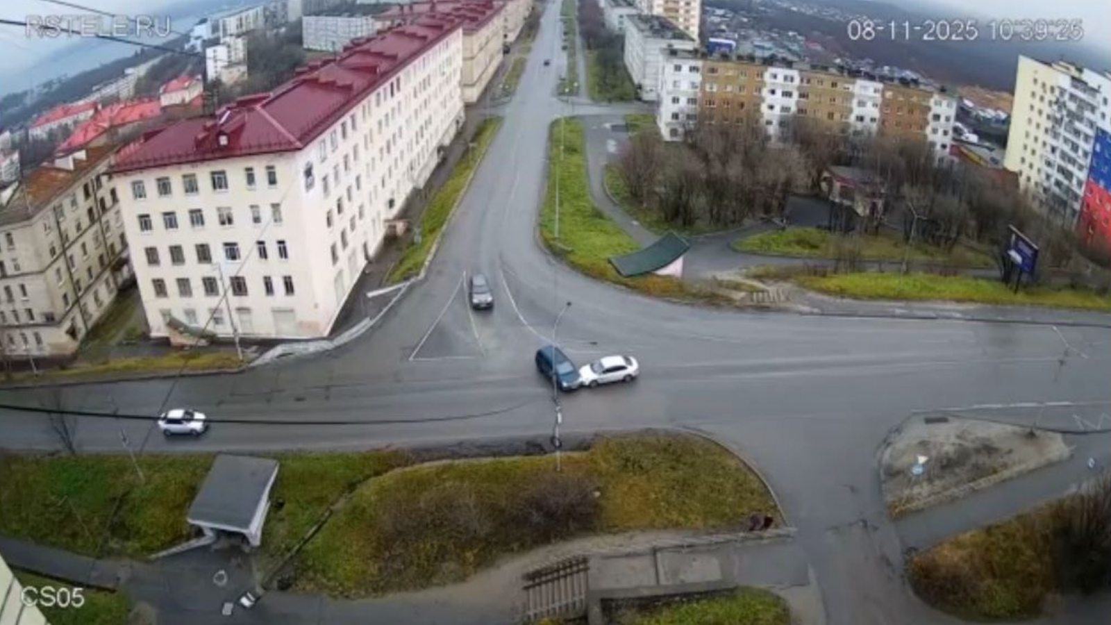 В Североморске накануне нелепое ДТП попало на видео: пустая дорога и большая дистанция, которой все равно не хватило, чтобы избежать столкновения на перекрестке.