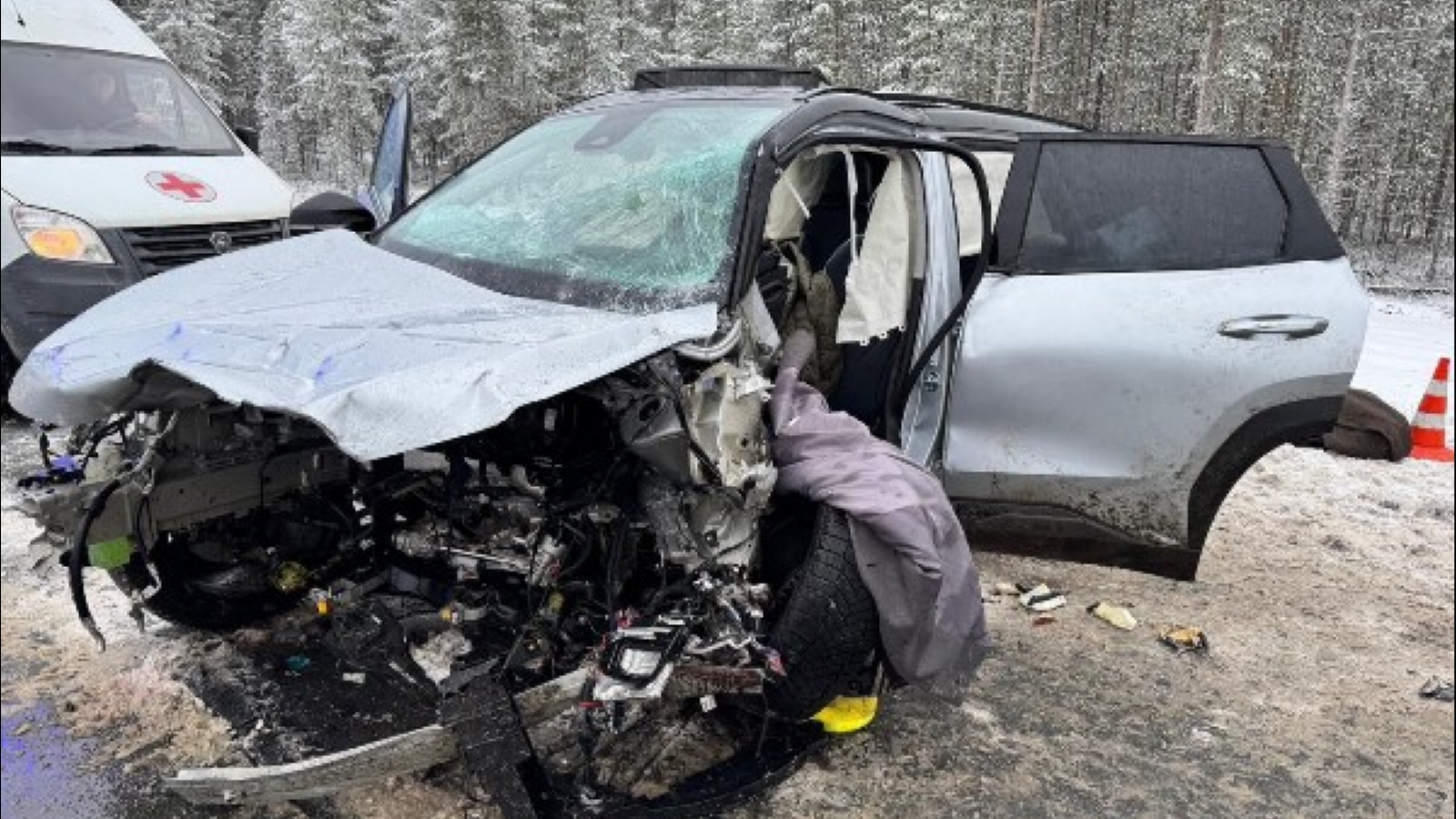 По предварительной информации Госавтоинспекции, водитель Geely Atlas, двигаясь со стороны Мурманска, допустил выезд на полосу встречного движения, где столкнулся с Nissan Almera.