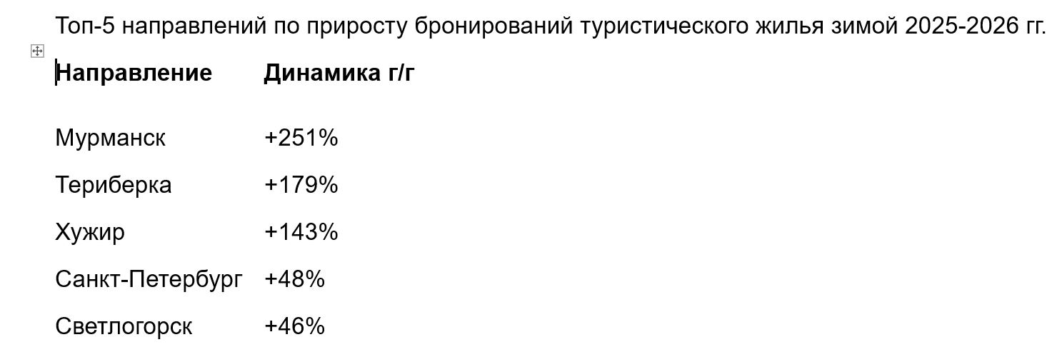 В этом году Мурманск поднялся на третью позицию по числу бронирований (8% от всех заказов), уступив только Москве (19%) и Санкт-Петербургу (13%). При этом арктическое направление опередило все остальные по приросту заказов на зиму 2025 – 2026.