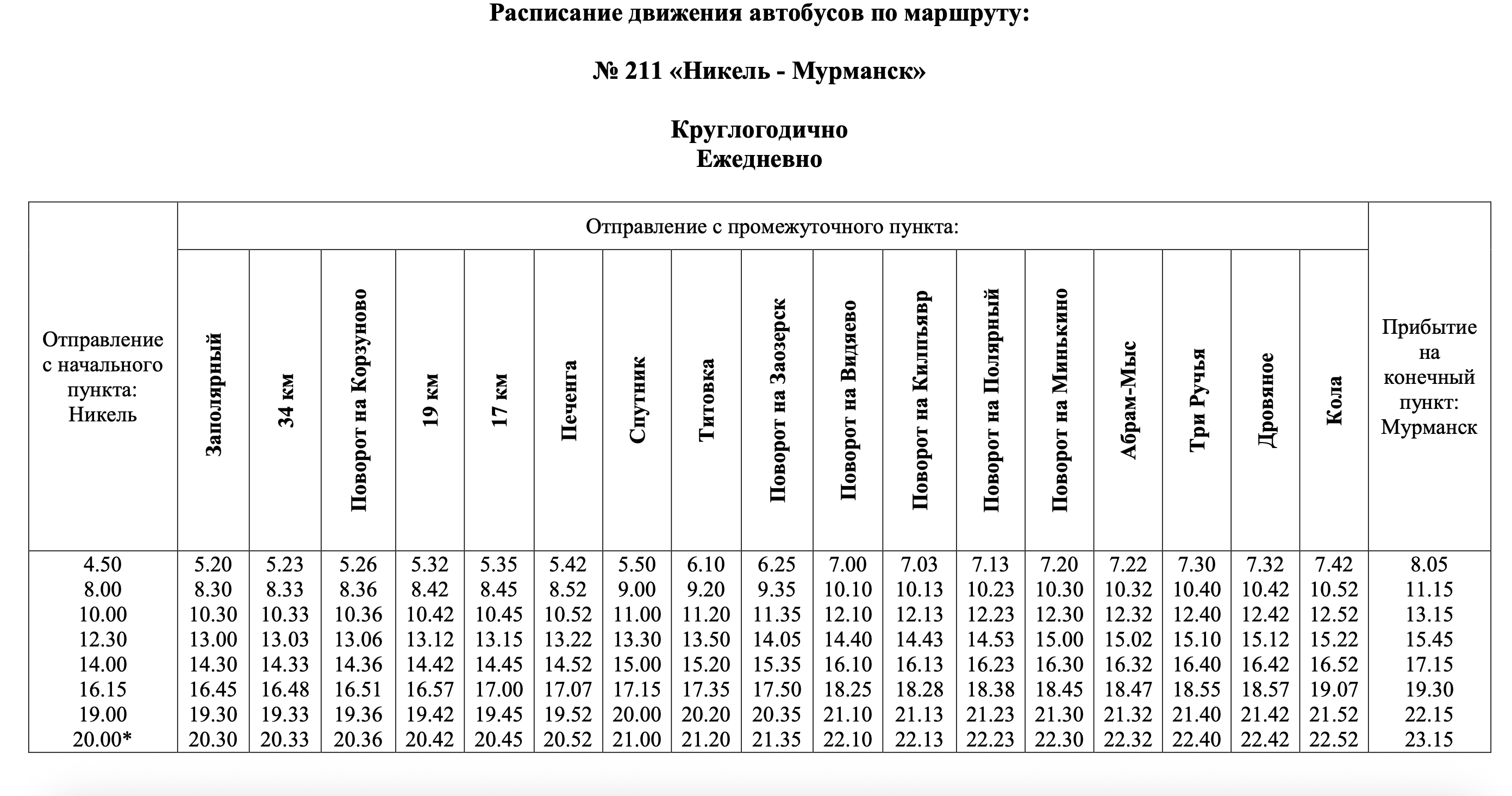 С 5 декабря 2025 вносятся изменения в расписание движения автобусов по маршруту № 211 «Никель - Мурманск».