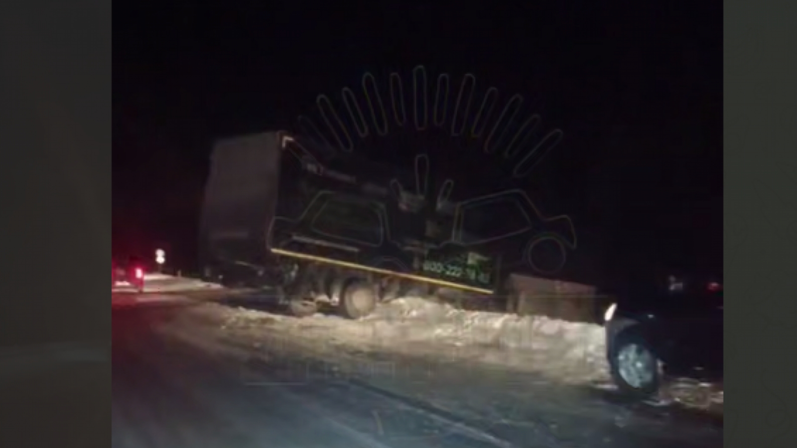 Как видно на записи, большегруз вылетел с дороги в придорожные сугробы.