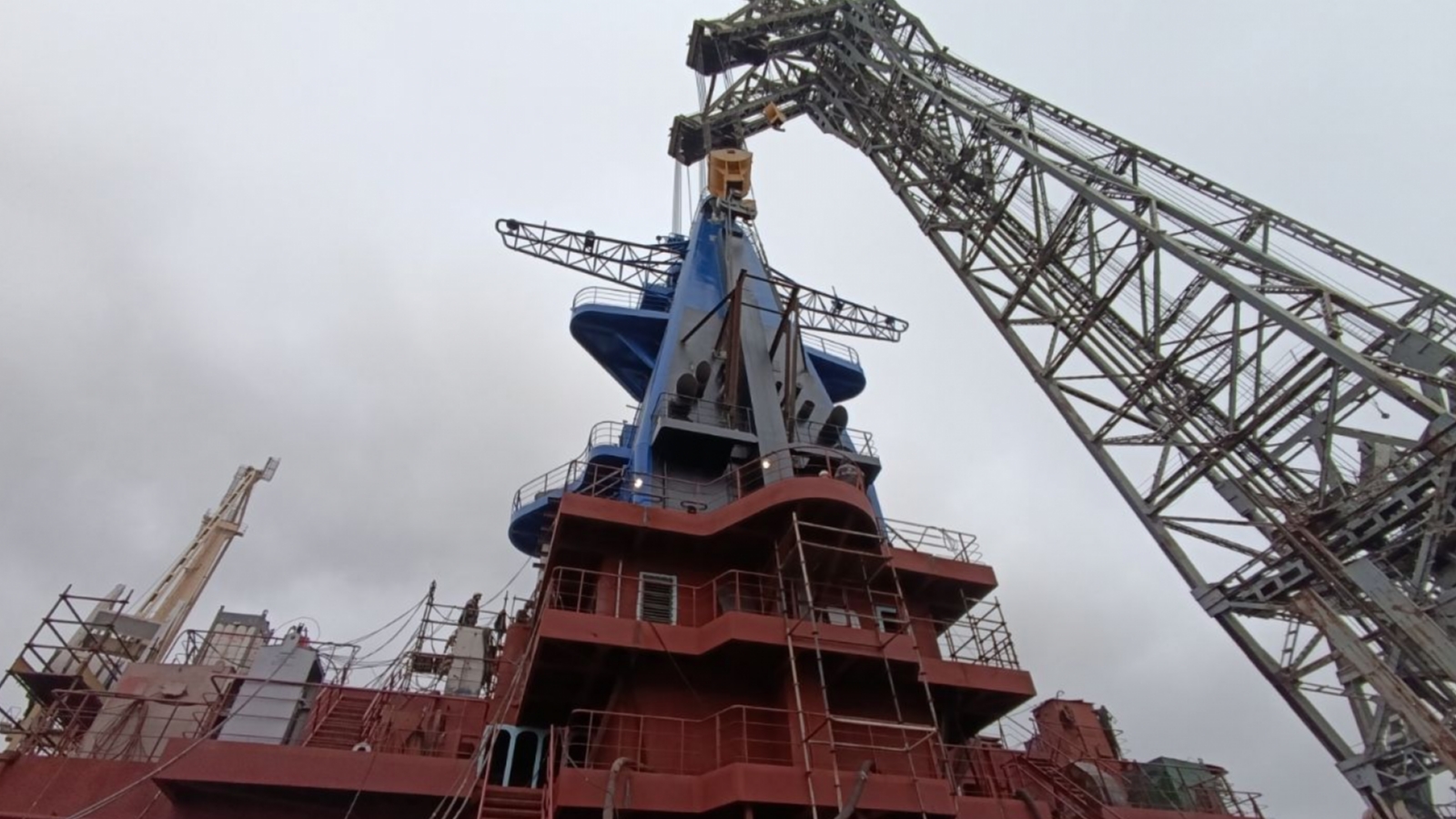 Корабелы погрузили на судно мачту высотой 18,6 м и весом 76 тонн, оборудованную газоходами от резервных дизель-генераторов, атмосферными и воздушными трубами, шпигатной системой для удаления воды.