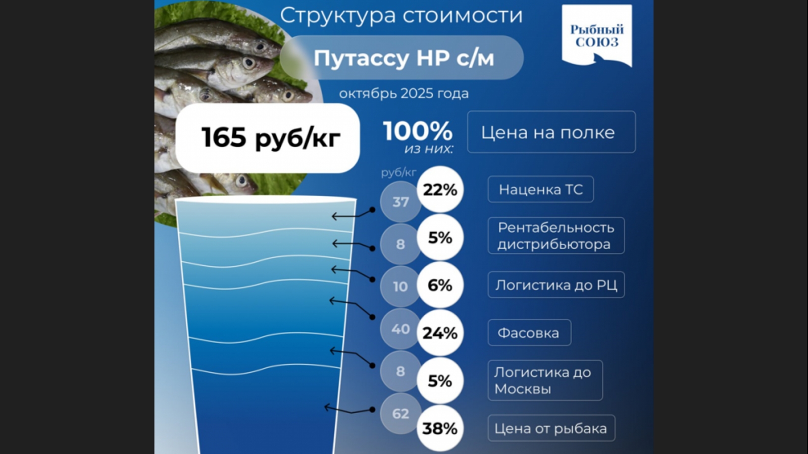 Путассу дорожает в 2,6 раза на пути от рыбака до прилавкаВ октябре 2025 года стоимость килограмма свежемороженой неразделанной путассу составляет 165 рублей за кг. И только 38% от этой цены или 62 рубля...→