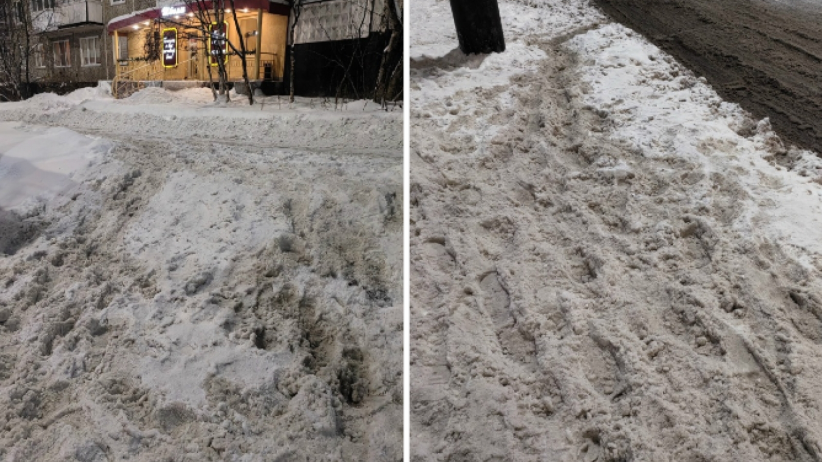 Снег на остановке не чистят, людям приходится пробираться через снежную кашу. Особенно тяжело пожилым и женщинам с колясками.