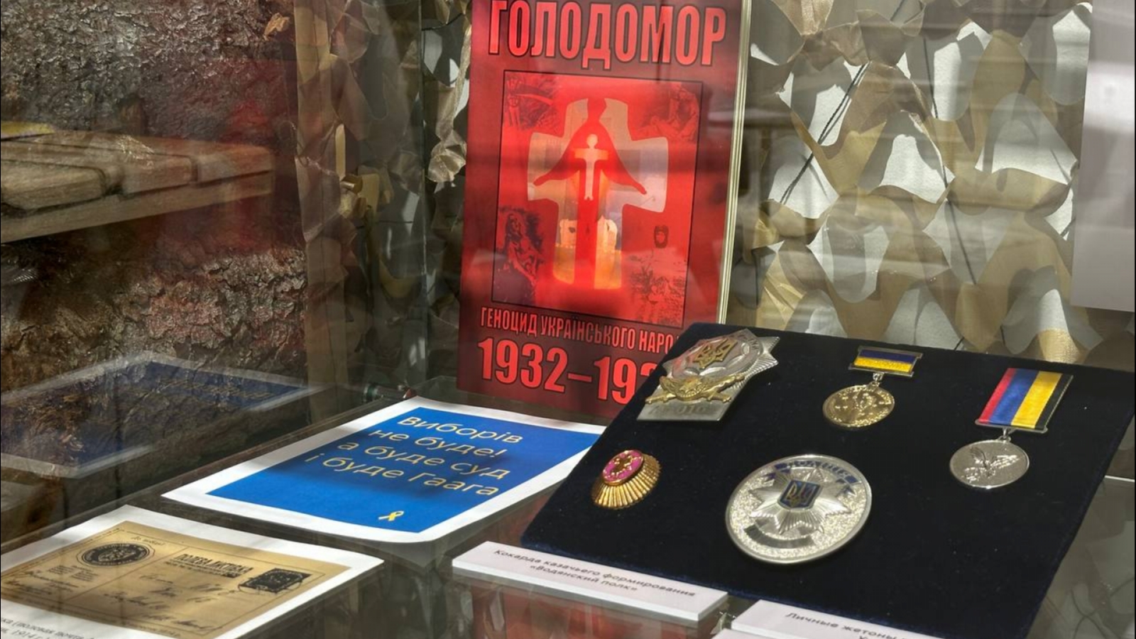 Среди новых экспонатов — флаг 123-й отдельной бригады территориальной обороны Украины, снятый российскими бойцами с водонапорной башни в Херсонской области летом 2025 года. Также представлена брошюра «Голодомор — геноцид украинского народа 1932–1933 гг.», которая была взята в качестве трофея в октябре 2022 года при освобождении села Дудчаны Херсонской области.