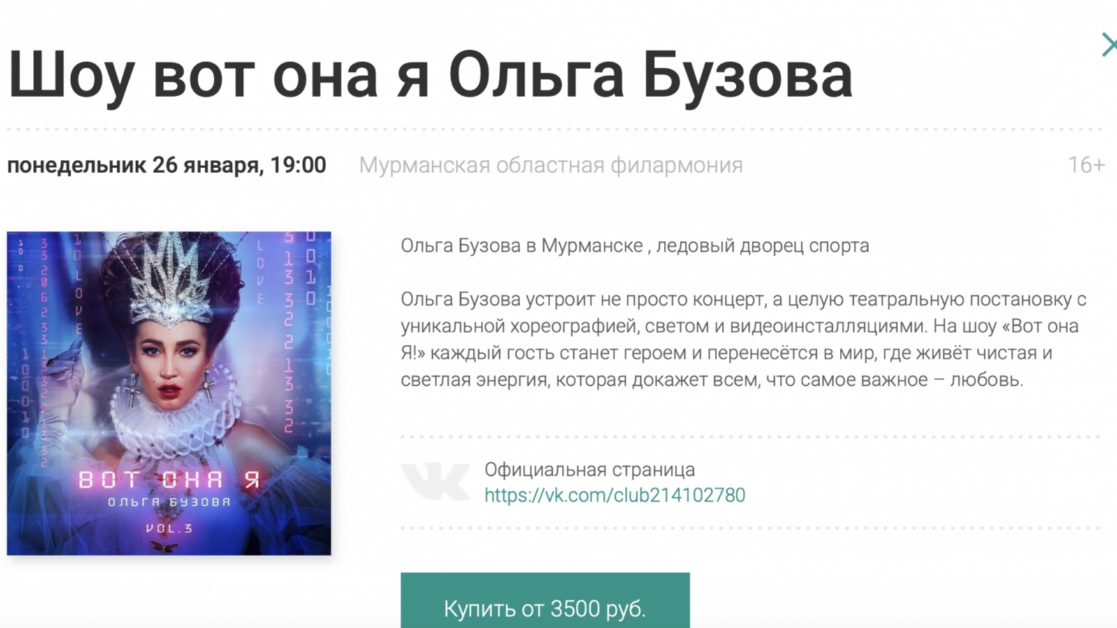 Один из ресурсов по продаже билетов на мероприятия разместил информацию о том, что в Мурманске состоится концерт популярной исполнительницы Ольги Бузовой.
