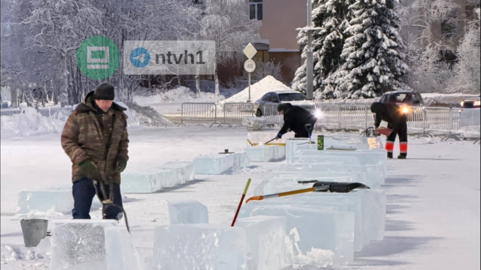 На центральной площади Апатитов рабочие обрабатывают и устанавливают ледяные блоки, пишут в группе «Хибины Апатиты Кировск Народное ТВ».