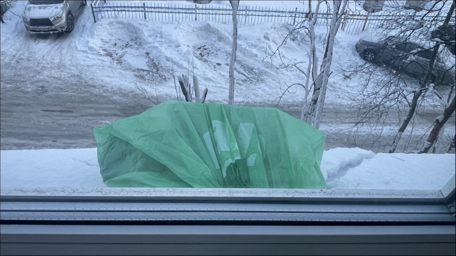 В Ленинском округе Мурманска из-за отсутствующего электричества не работают холодильники. Жители вешают продукты в пакетах за окно.