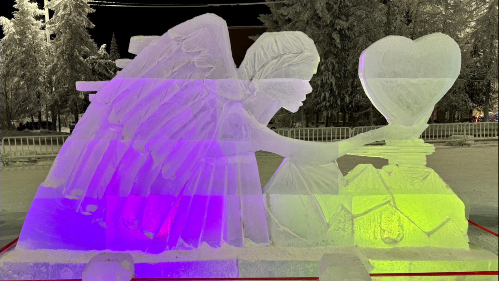В Апатитах ледяные скульптуры, созданные во время проведения шоу-конкурса «Бешеная пила», подсветили.