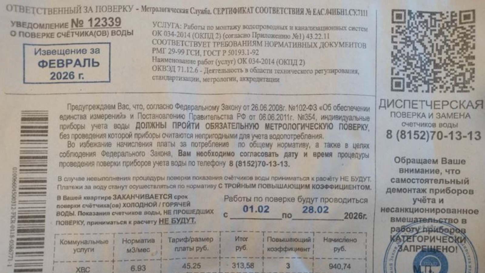 Северян принуждают к проведению «метрологической поверки» водосчётчиков. Причём, всем подряд пишут, что заканчивается срок поверки. И телефончик тут же нарисован, чтобы вызвать домой «поверщиков».