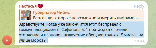 «Когда уже закончится этот беспредел с коммунальщиками?! Сафонова 5, 1 подъезд отключили отопление и плановое включение обещают только 15 числа, на улице морозы!», — жалуется Настасья.
