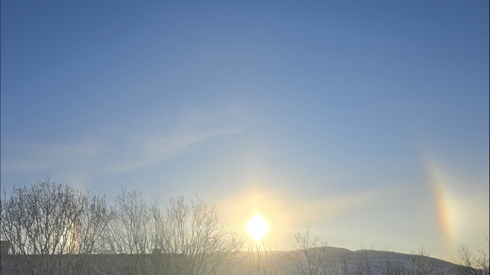 В Мурманске можно снова увидеть солнечное гало. Благодаря инею, который кружит в воздухе, солнечный круг не белый, а радужный.