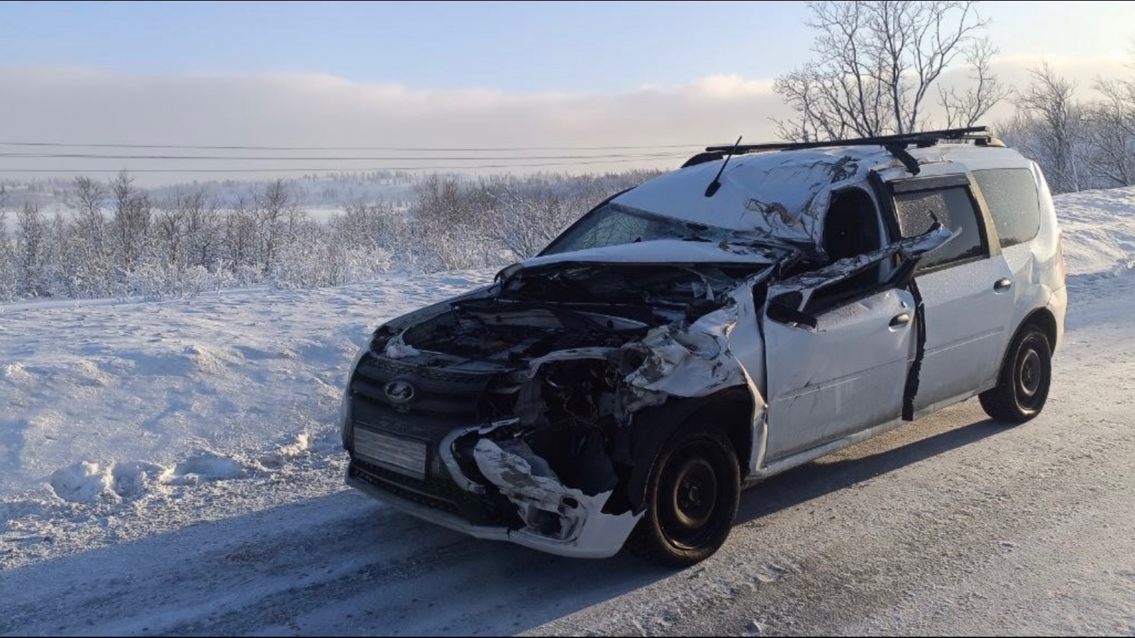 В Кольском округе на 22 км автодороги Мишуково - Снежногорск произошло столкновение по касательной Lada Largus и манипулятора ГАЗ «Егерь».