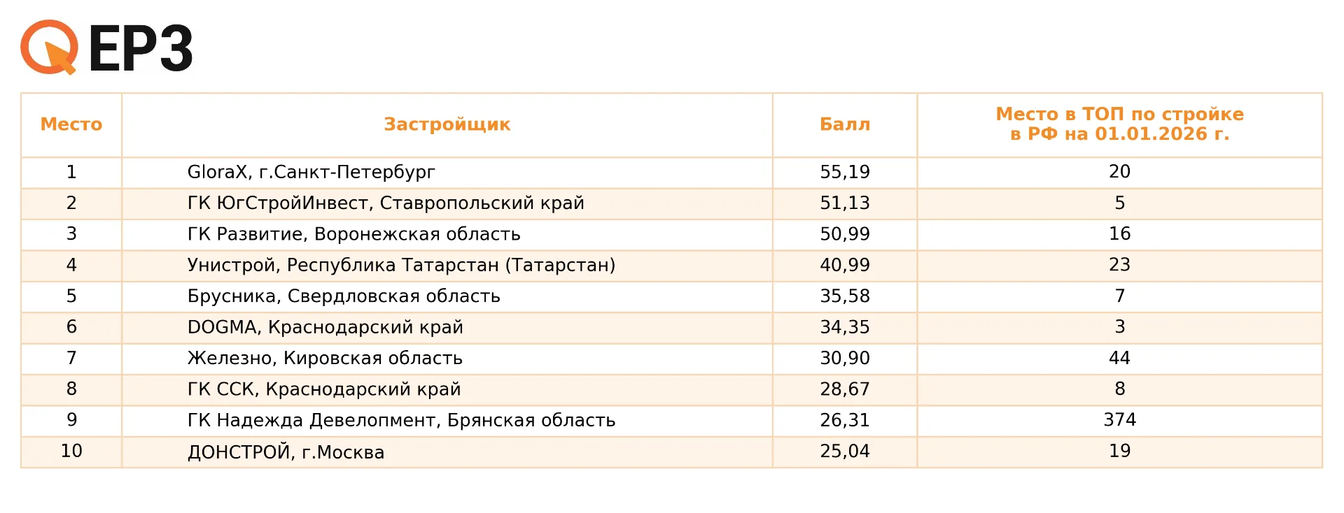 По итогам 2025 года лидером ТОП стал GloraX, набравший 55,19 балла. За год девелопер существенно продвинулся в ТОП по объёму текущего строительства (с 44-го на 20-е место), продолжил региональную экспансию, увеличив количество регионов строительства (продаж) с 6 до 8, а количество строящихся проектов выросло с 8 до 15.