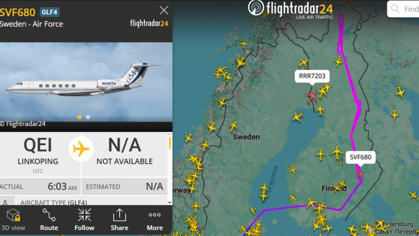 Первым в гости пожаловал шведский Gulfstream IV S102B Korpen — самолёт радиотехнической разведки. Он вылетел из Линчёпинга в 09.03 по московскому времени.