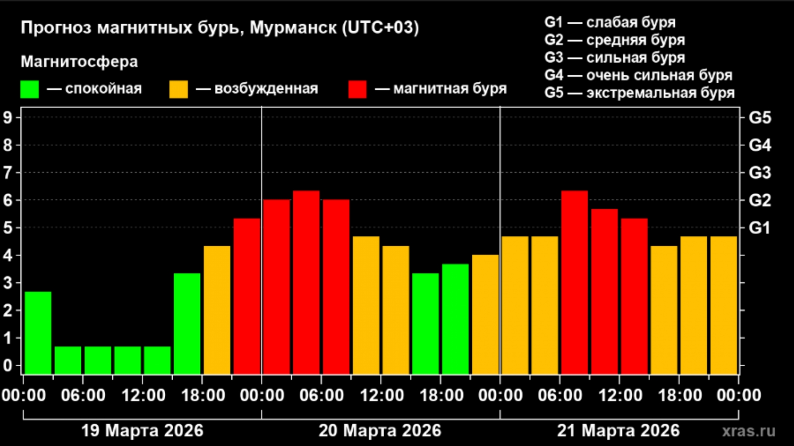 Возмущение магнитосферы может начаться уже с 18 часов 19 марта. К полуночи начнётся собственно буря, к вечеру 20 марта стихия немного успокоится, но 21 марта может разгореться с новой силой.