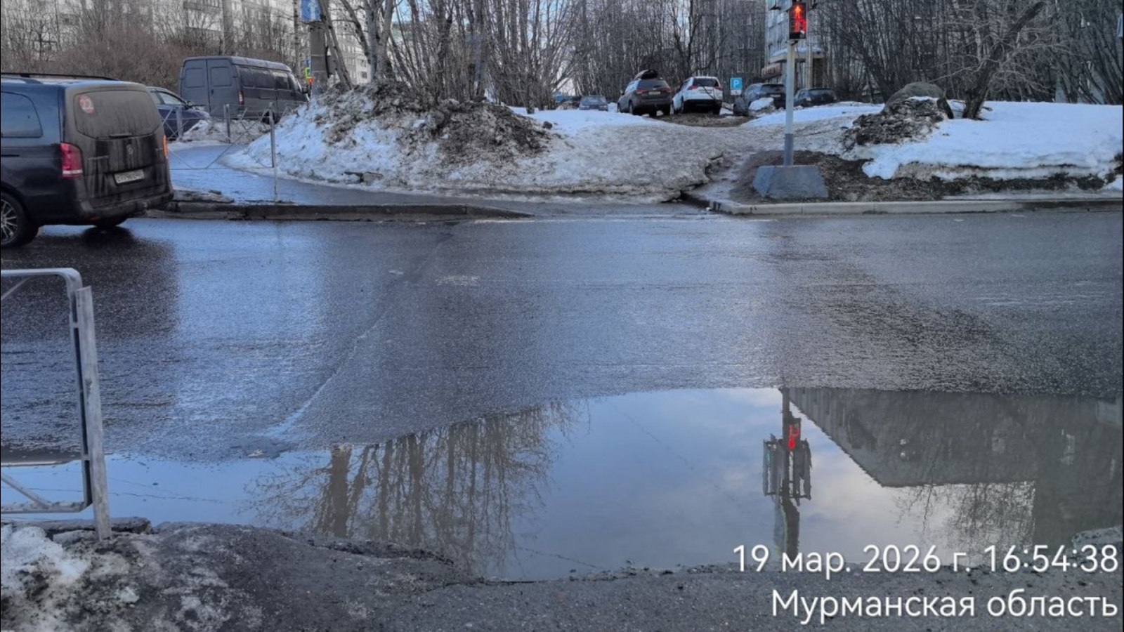 В Мурманске жители жалуются на лужу на пешеходном переходе на улице Карла Маркса. По словам северян, она образуется там каждый год.