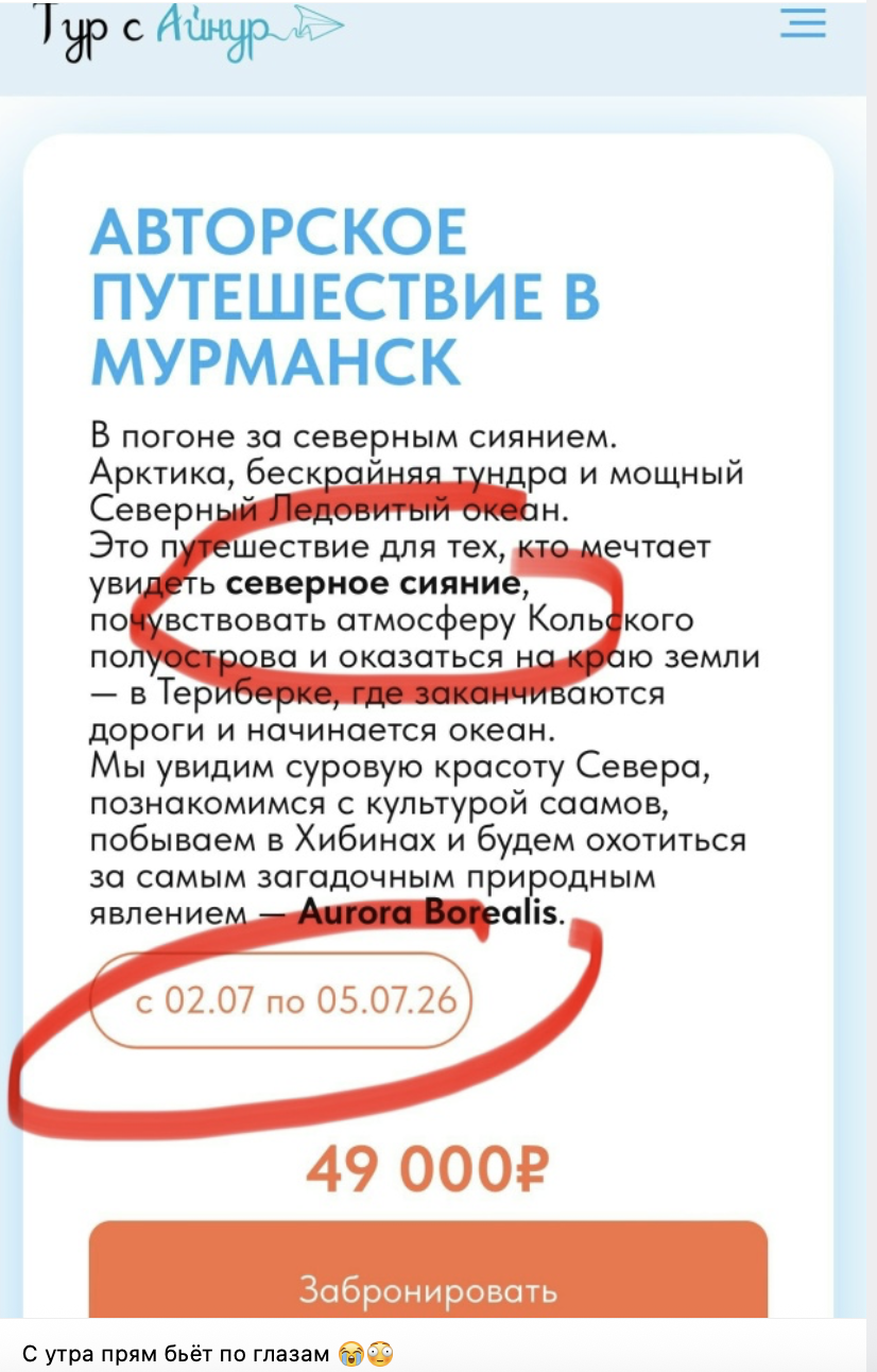 Каким образом туристам «покажут» обещанное атмосферное явление в период полярного дня – не уточняется.