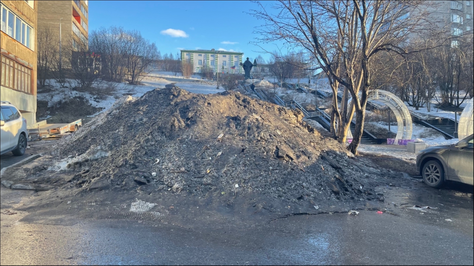 Мурманчане высказали недовольство снежной кучей на улице Воровского в заполярной столице.