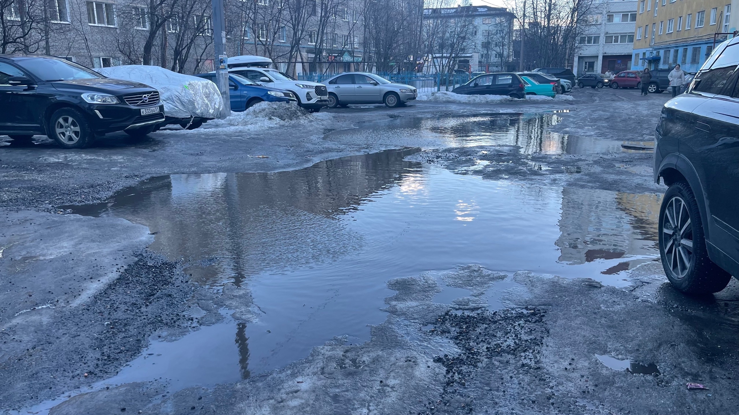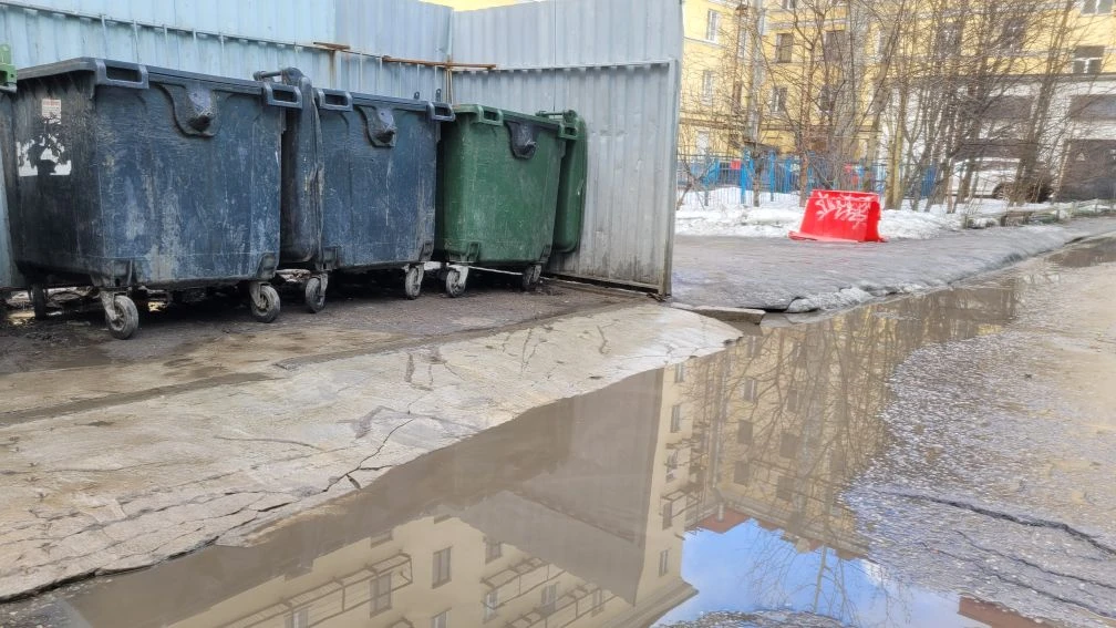 Натура для «мариниста» и мурманский двор на Ленина, 66. В «водоеме» у мусорных баков несанкционированное «озеро».