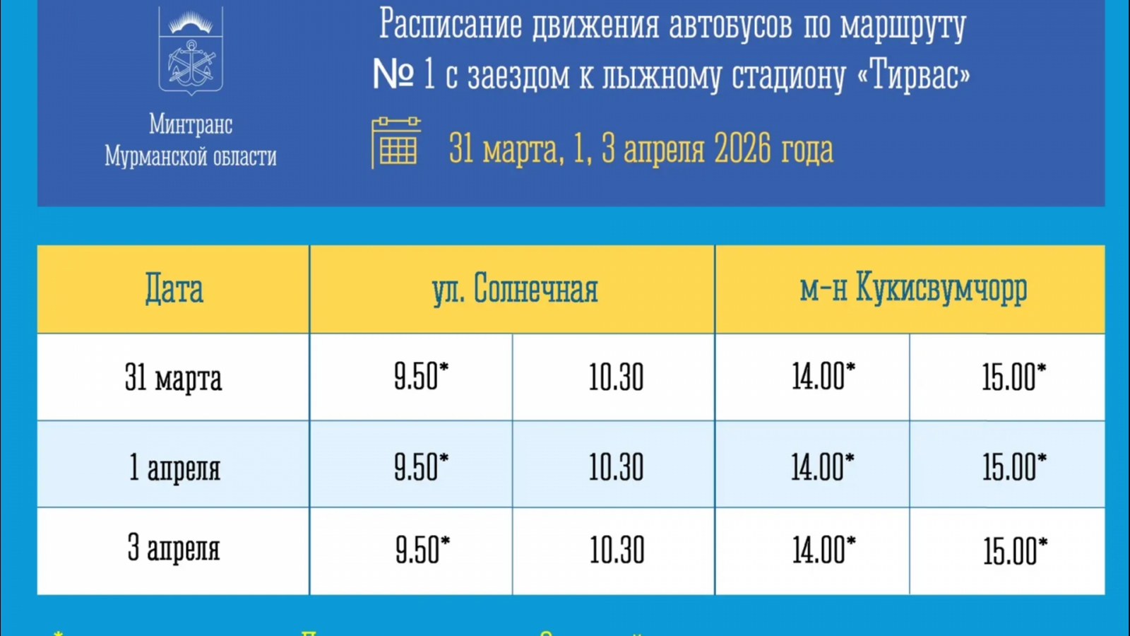 «31 марта, 1 и 3 апреля будут организованы заезды к стадиону «Тирвас» маршруту № 1 «ул. Солнечная– ул. Ленинградская - м-он Кукисвумчорр» (г. Кировск)», - говорится в сообщении.
