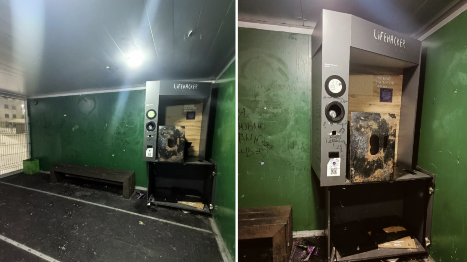 Тёплая установка, которая ранее была смонтирована в Заполярном, находится, мягко говоря, в неподобающем виде: стены исписаны, повсюду мусор, повреждены потолочные панели.
